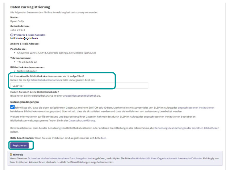 - Die Registrierung kann ohne Bibliothekskarte abgeschlossen werden.