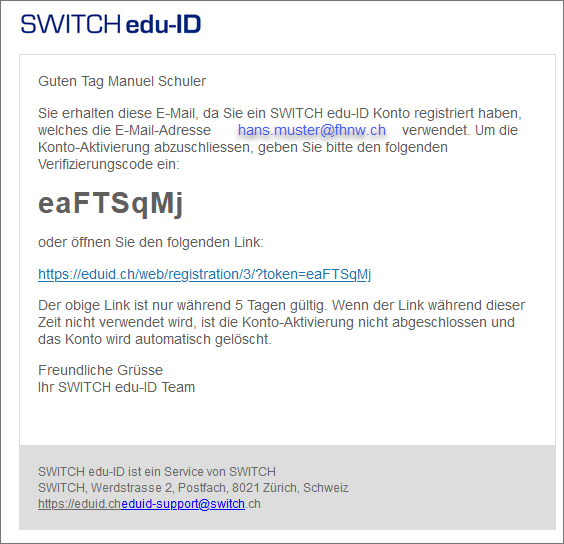 Dein Konto wurde erstellt. Die Aktivierung wird dir von der SWITCH wiederum per E-Mail bestätigt. Nun bist du bei der SWITCH registriert.